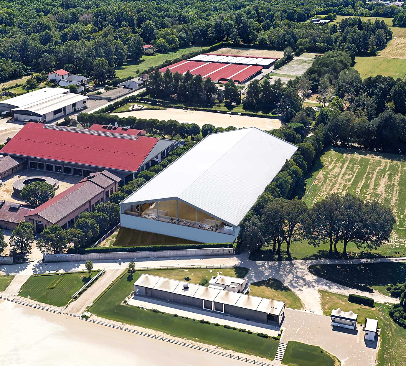 The indoor warm-up arena designed for the Equieffe Equestrian Centre in Milan establishes a strong dialogue with the existing architectural language while introducing a layered and dynamic spatial organization shaped by level differences. An elevated circulation and viewing system overlooks both the warm-up and the main arena, enhancing the spectator experience and spatial continuity.